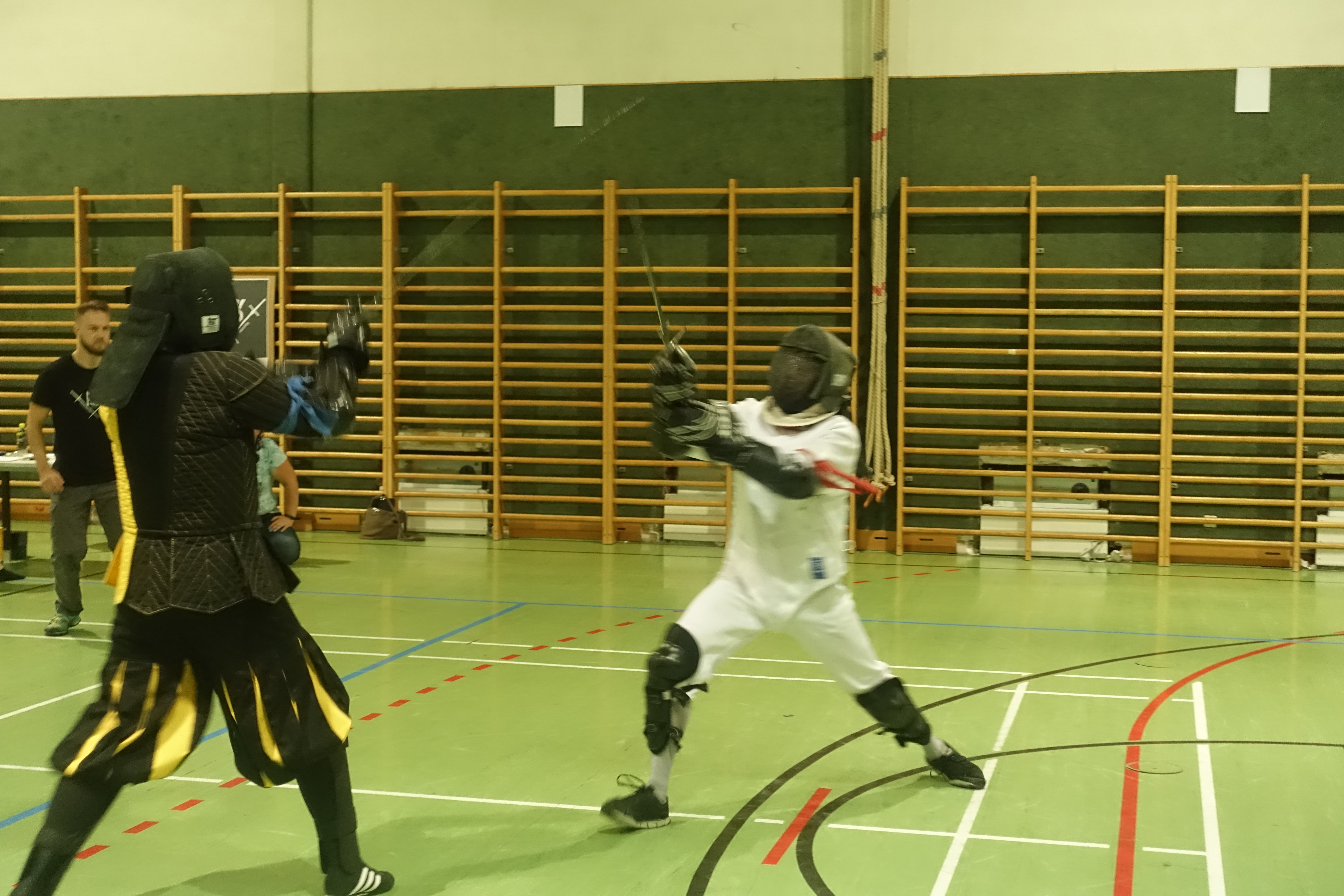 Von Anfang an war es unsere Absicht, kein reguläres Turnier mit allen Schikanen abzuhalten, sondern eine Turniersimulation zu veranstalten, die sich weder in den Rankings des ÖFHF noch sonst wo auswirken würde. Wichtigster Unterschied zu einem Bewerb: die Treffer sollten von den FechterInnen jeweils selbst angezeigt werden, was ein hohes Maß an Fairness voraussetzt. Wie sich zeigte, waren wir zu Recht optimistisch genug, diese Variante zu wählen: die Kampfrichter Benedikt, Rainer und Julia hatten mehr mit dem Verwalten der angezeigten Treffer und mit dem Abwägen, ob die Intensität für einen regulären Punkt ausreichend gewesen war, zu tun als mit dem Entlarven von Punkteräubern oder dem Vergeben von Ermahnungen und Verwarnungen wegen zu großer Härte oder anderer Unsportlichkeiten. Trotzdem waren Länge der Gefechte, Trefferzahl und die meisten anderen Details von einem regulären Turnier kaum zu unterscheiden.