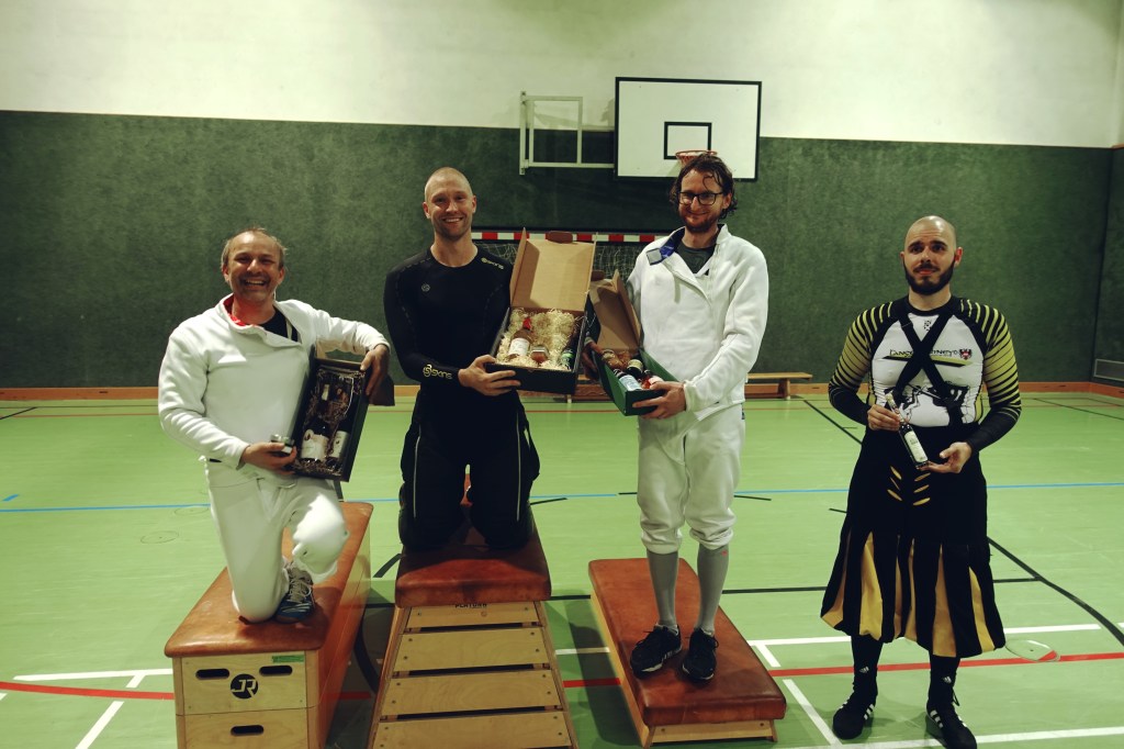 Was fasziniert an einem Fechtturnier? Es wäre unredlich zu leugnen, dass sich kurz vor dem Bewerb ein gewisser Nervenkitzel bei den TeilnehmerInnen einstellt. Das Spiel zwischen dem Vertrauen in die eigenen Trainingserfolge und der Ungewissheit über die fechterischen Fähigkeiten der Gegnerinnen und Gegner erzeugt eine Spannung. Ich denke, diese Spannung zu suchen und zu erleben ist ein starkes Motiv, sich in ein Turnier zu begeben. Natürlich hat auch das alte, einfache Spiel „Wer ist besser?“ seinen Reiz. Es ist nicht unspannend, sich selbst dabei zu beobachten, wann der Ehrgeiz, ein Gefecht für sich zu entscheiden, dann doch einsetzt. Aber ein wichtiges (wenn nicht das zentrale) Motiv ist die Gelegenheit, dem Erlebnis einer historischen Duellsituation ein gutes Stück weit näher zu kommen als in Training oder bei Sparringeinheiten. Sich einerseits auf die Auseinandersetzung einzulassen und andererseits darauf verlassen zu können, dass die Treffer, die man setzt und die man einsteckt keinen wirklichen Schaden anrichten werden, versetzt (zumindest mich) in einen Zustand hoher Konzentration, Anspannung aber auch Leichtigkeit, der sonst kaum erlebbar ist. Und ja, der Papa freut sich einfach, wenn die Tochter endlich auch einmal ihre ersten Punkte am Turnierplatz erfochten hat: Gratuliere, Leonie! Daher ist es auch unbedingt notwendig, sich bei den vielen Händen und Köpfen zu bedanken, die die trotz geringer Größe beachtliche Vorarbeit geleistet haben und sich während der Veranstaltung als Richter, ProtokollantInnen, Möbelträger usw. zur Verfügung gestellt haben: Danke Gerhild, Rainer, Gudrun, Benedikt, Hannah, Julia! Ihr habt zum Teil sogar auf den Genuss des Fechtens verzichtet, um uns ein wirklich schönes Erlebnis zu ermöglichen, danke!