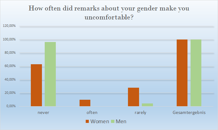 Furthermore, 13% of women who filled out the survey stated that they are often made to feel like they don’t belong, a feeling reported only by 2,4% of the male participants. Of course, this is a very broad descriptor, yet it could be a symptom of an underlying multifaceted problem which will be addressed in more depth in the discussion part of this article.