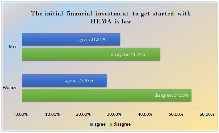 Male participants report that they perceive buying HEMA equipment as less expensive, even cheap in some cases, compared to their female peers. Twice the percentage of women compared to the percentage of men selected “too expensive, I had to stop buying gear”, no woman selected “cheap, I don’t have to think twice”, 20% perceived it as “very costly” with only 11% perceiving the cost of equipment as reasonable (22% of men selected this answer).