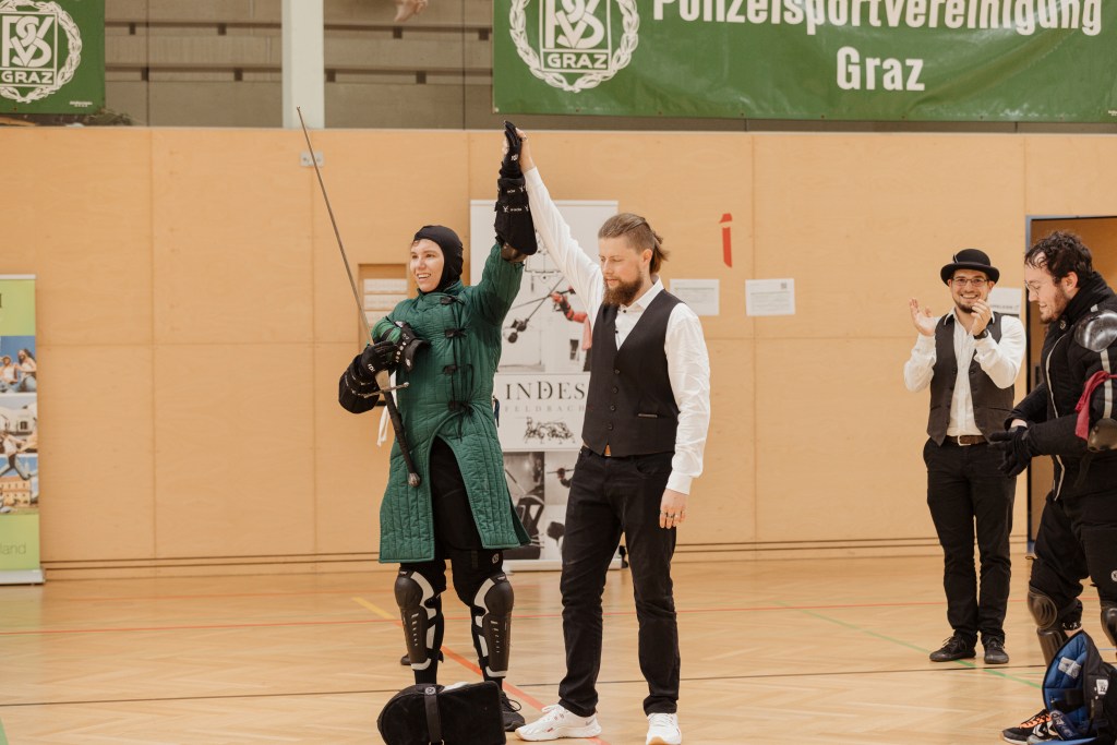 Um zu gewährleisten, dass unsere ohnehin schon viel geforderten Kampfleiter und KampfleiterInnen sich ganz auf ihre Arbeit konzentrieren konnten, haben wir im Vorfeld ein Probeturnier für Schreiber und Schreiberinnen organisiert. Das bedeutet Kampfleiter mussten nicht darüber nachdenken, wie viele Punkte plus oder Abzug ein Fechter bekam sie konnten einfach gesehene gültige Treffer ansagen und das Assistenzteam notierte die entsprechenden Punkte und nahm die Zeit. Die Definition, was gültige Treffer sind, wurde dem ÖFHF Regelwerk gegenüber n generell war es uns ein besonderes Anliegen, dass die KLs Ruhezeiten hatten und möglichst stressfrei ihrer Tätigkeit nachgehen konnten, weswegen wir mehr als nötig vor Ort hatten in der Hoffnung, das der Sterzhaw auch bei Kampfleitern und Kampleiter-Assistenten als tolles Event in Erinnerung bleibt, bei dem man gerne wieder mitmacht.